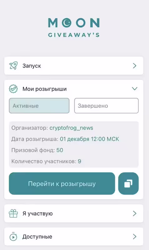 Когда розыгрыш будет завершён, призы автоматически распределяются на кошельки пользователей в MOON Giveaways