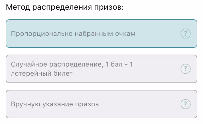 - Пропорционально набранным очкам: Победители получают призы в зависимости от количества заработанных баллов.