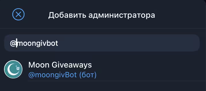 💡 Совет: Чтобы добавить бота в администраторы, откройте настройки вашего канала → выберите «Администраторы» → нажмите «Добавить администратора» → введите @moongivbot.