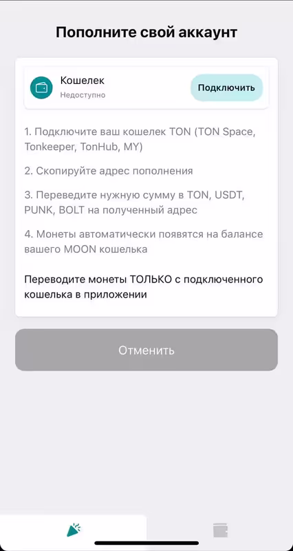 ВАЖНО! Подключайте именно тот кошелек, который вы планируете использовать в приложении. Пока что функции смены кошелька не предусмотрено, но мы работаем над этой функцией