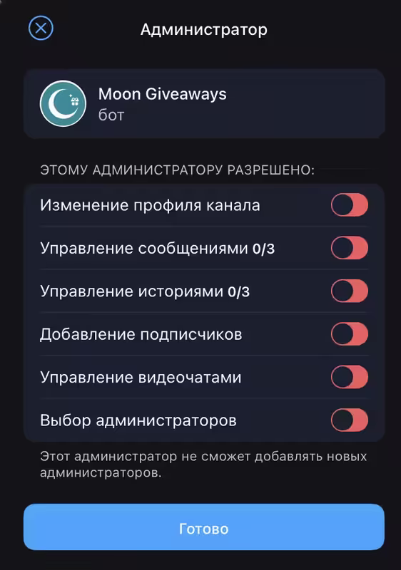 3. Убедитесь, что бот @moongivbot добавлен в администраторы каждого канала. Это позволит MOON Giveaways проверять подписки.