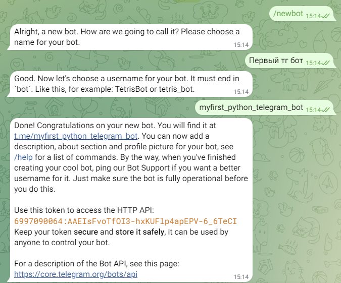 Поздравляю, вы сделали своего первого телеграмм бота! В следующих частях мы будем дополнять его новыми фунциями и выучим много чего нового.