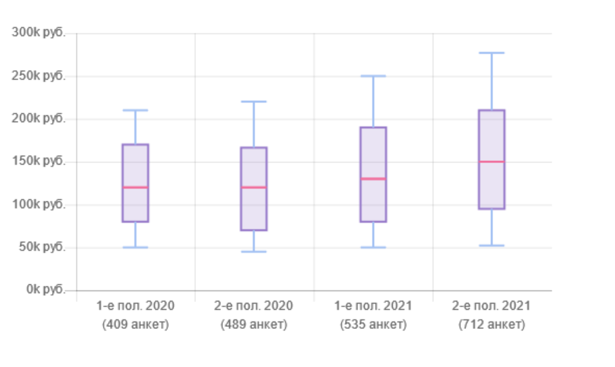 Большой спрос на разработчиков со знанием Python означает и большие зарплаты. По данным Хабр Карьера средняя зарплата Python программиста во 2-м полугодии 2021 года составляет 160 000 рублей. Наблюдается постепенный рост вилки: