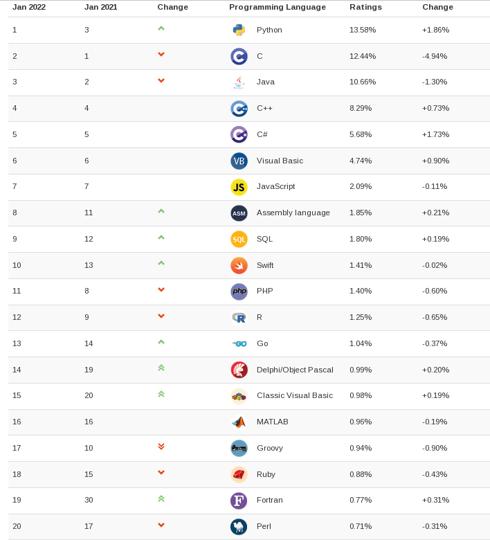 С этим пунктом у читателей нашего канала не должно возникнуть сложностей. Python в начале 2022 года занимает 1 место в рейтинге языков программирования по версии Tiobe: