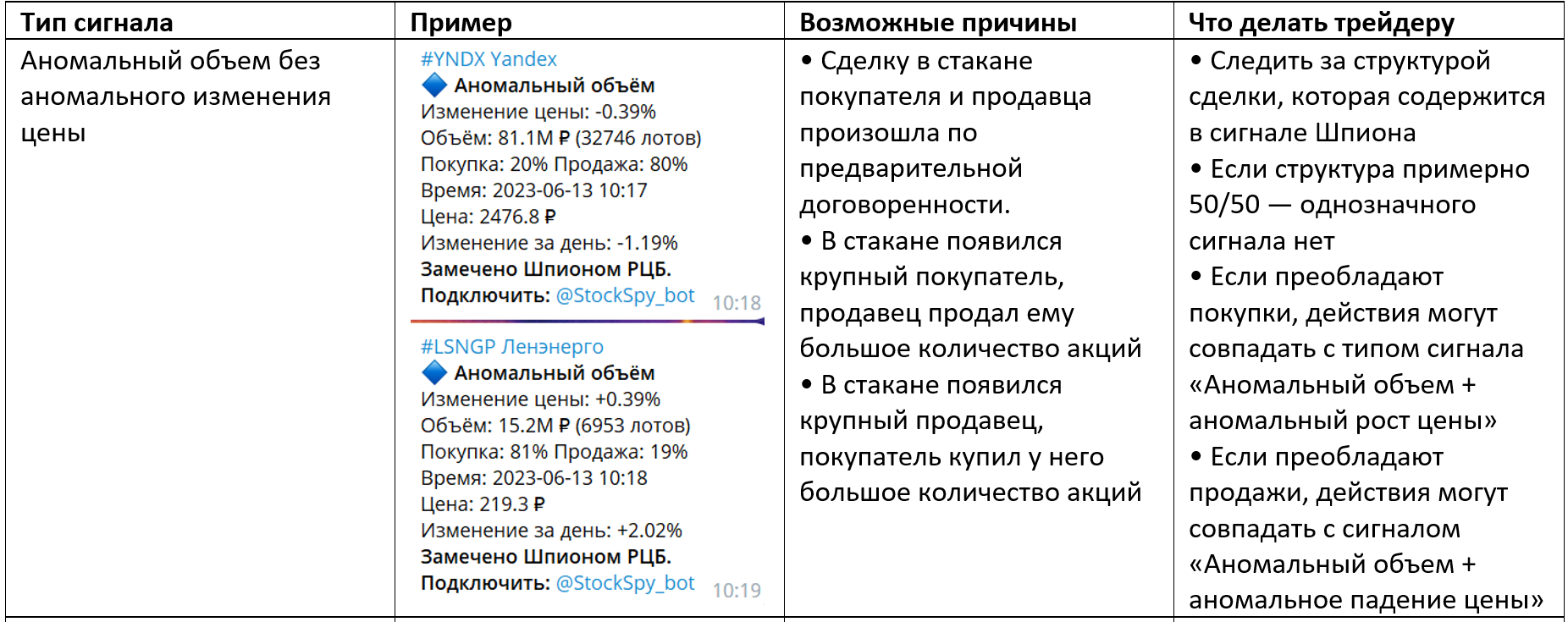 Шпион РЦБ @StockSpy_botАномальные объемы и изменение цены — самый частый тип уведомлений в Шпионе РЦБ, позволяющий увидеть необычные сделки на бирже. Это могут быть покупки и продажи инсайдеров, крупных игроков, реакция на конкретное событие.