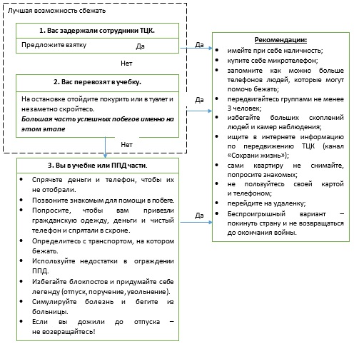 Наша команда подготовила алгоритм действий, основанный на опыте людей, прошедших через этот процесс. Он поможет вам следовать необходимым шагам во избежание насильственной мобилизации и содержит различные рекомендации, которые помогут вам как до, так и после.