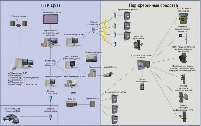 Управление дорожным движением — это не только светофоры, но и: камеры видеофиксации автомобилей, камеры наблюдения, магнитные и радиодатчики трафика, датчики температуры покрытия, камеры фиксации скорости и хер его знает что ещё. Типичный перекресток представляет из себя следующее: