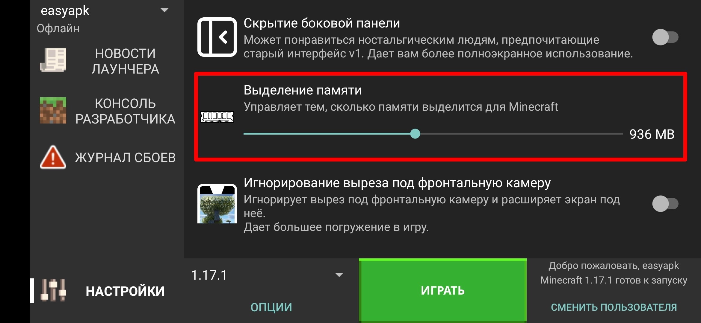 Как в лаунчере выделить память
