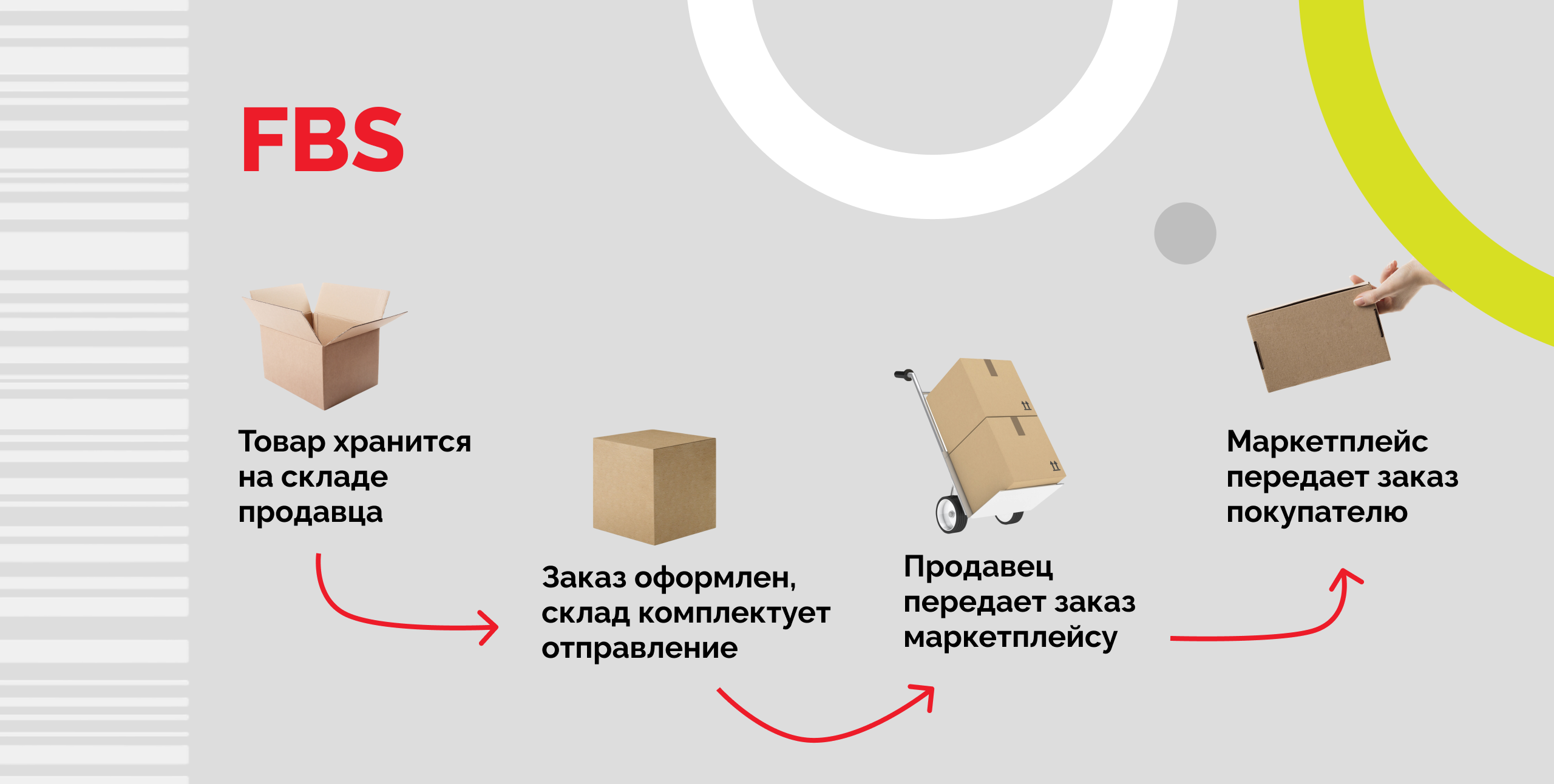 Fulfillment by Seller или FBS — это схема, в которой складские и логистические задачи разделены между продавцом и маркетплейсом. Продавец самостоятельно хранит товары, собирает и отправляет заказы в пункты приема, а также забирает возвраты.