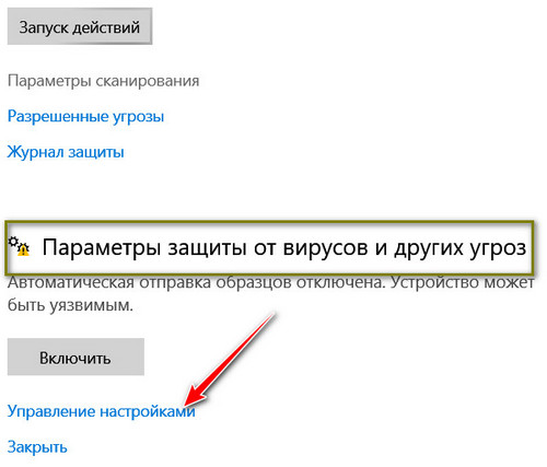 4. Под текстом «Параметры защиты от вирусов и других угроз» нужно найти и нажать на «Управление настройками».