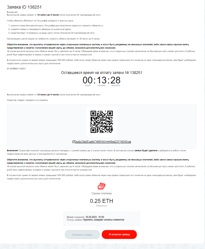 ВНИМАТЕЛЬНО ЧИТАЕМ УСЛОВИЯ !!! Здесь описаны время зачисления и другие параметры. Нам нужно скинуть ETH на этот адрес, после чего нажать кнопку "Я оплатил заявку"