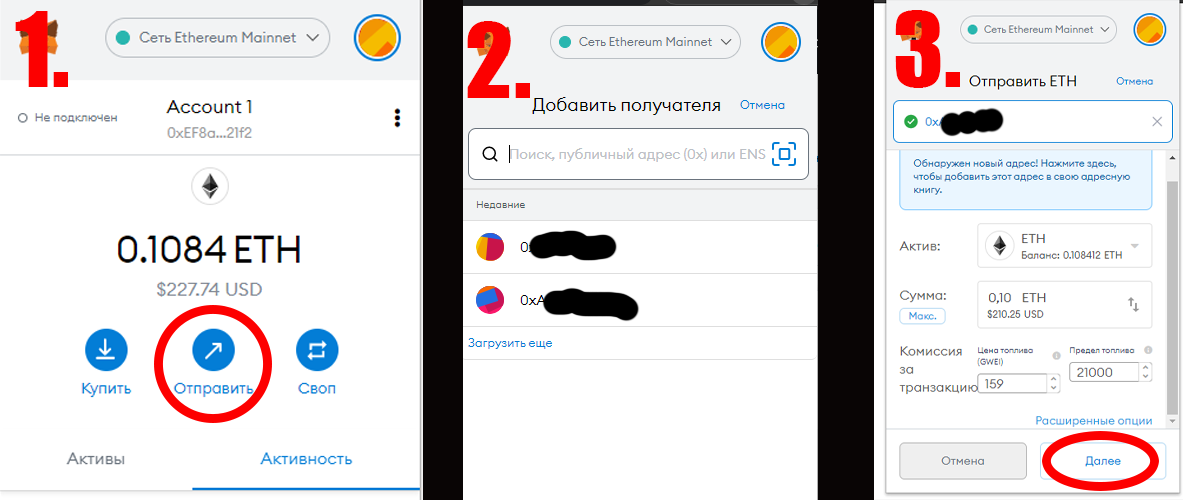 2) Вводим в поле номер кошелька, на который мы должны скинуть ETH,либо сканируем QR-код