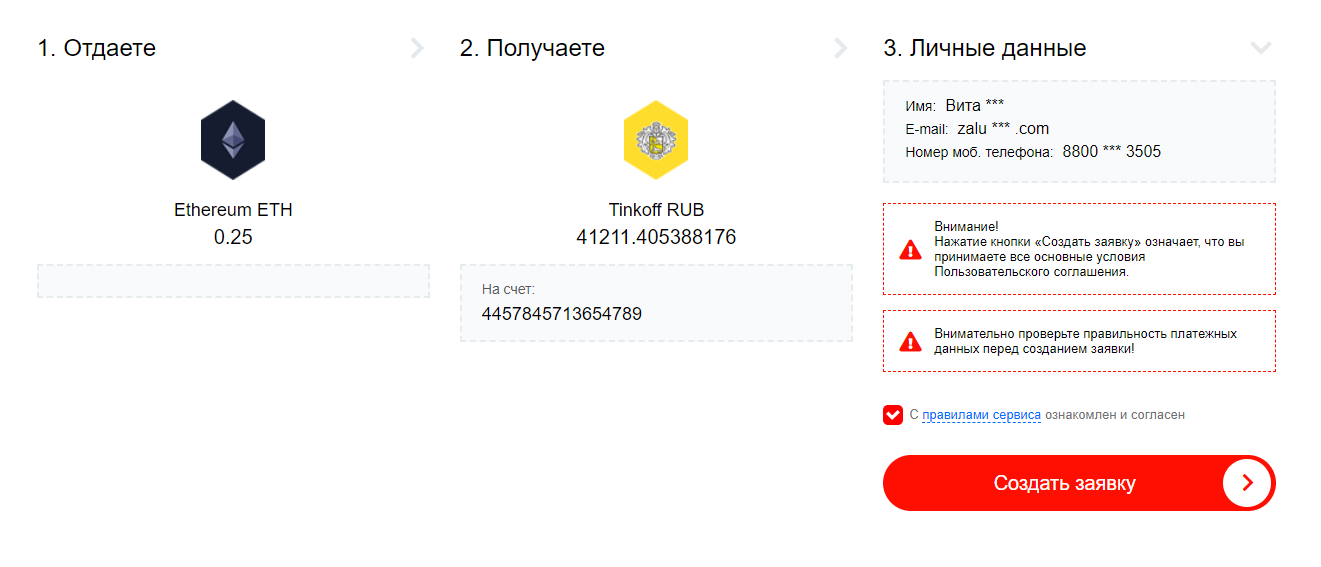 Далее нажимаем "Обменять" и попадаем на окно проверки. Проверяем и создаем заявку