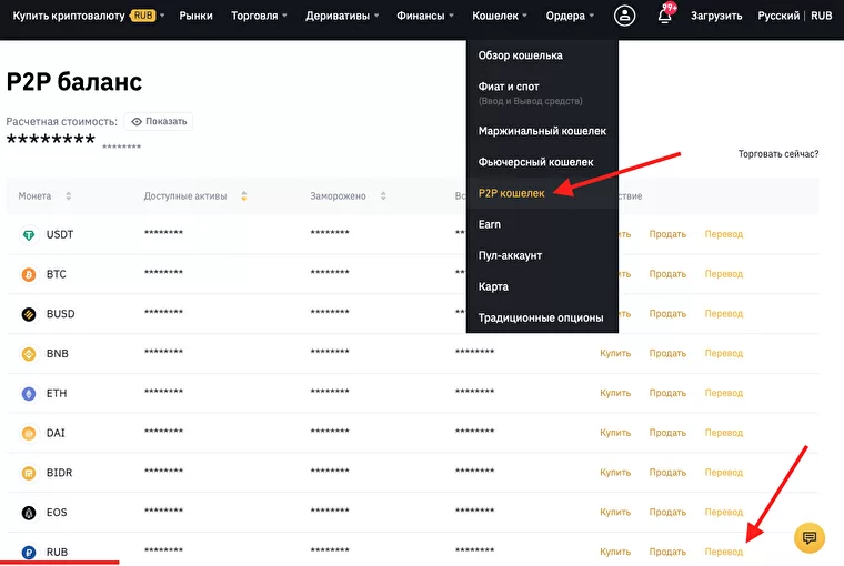 Чтобы вывести деньги с Binance на карту через P2P, необходимо перевести средства с спотового кошелька на P2P кошелек. Для этого переходим в P2P кошелек, выбираем нужную нам валюту и кликаем "Перевод". Продать через P2P можно USDT, BTC, BUSD, BNB, ETH, DAI и RUB. В качестве примера выведем рубли.
