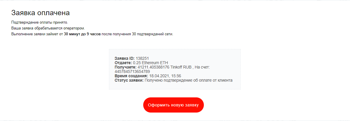 Теперь ждем, транзакция занимает около 30минут, иногда вы можете закинуть ночью, а обменник работает в ручном режиме, поэтому будьте внимательны. При любых проблемах пишите в саппорт.