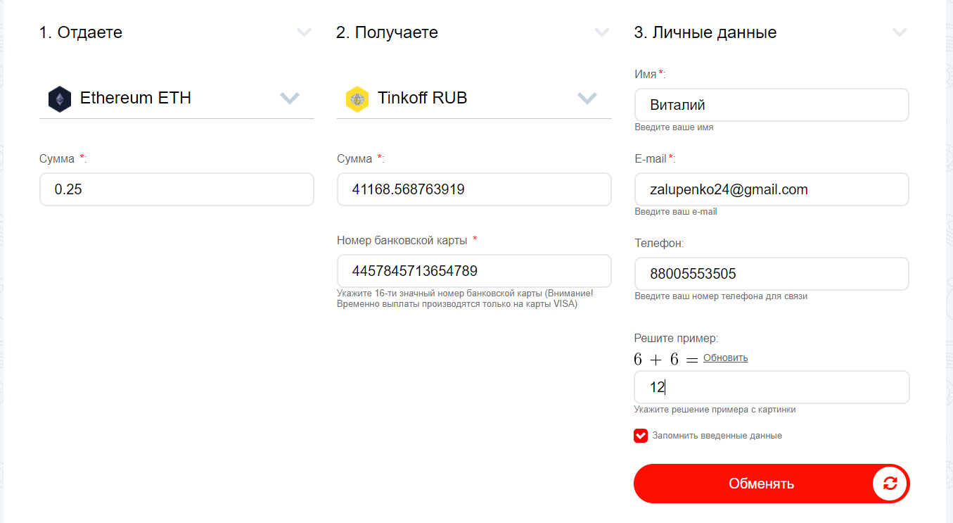 Сколько отдаем, какой номер карты, личные данные и решаем пример.