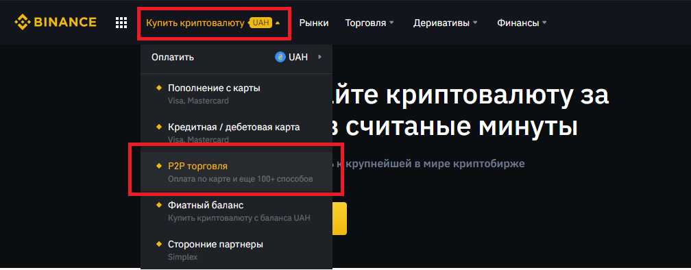 Выбираем в меню Купить криптовалюту раздел P2P торговля