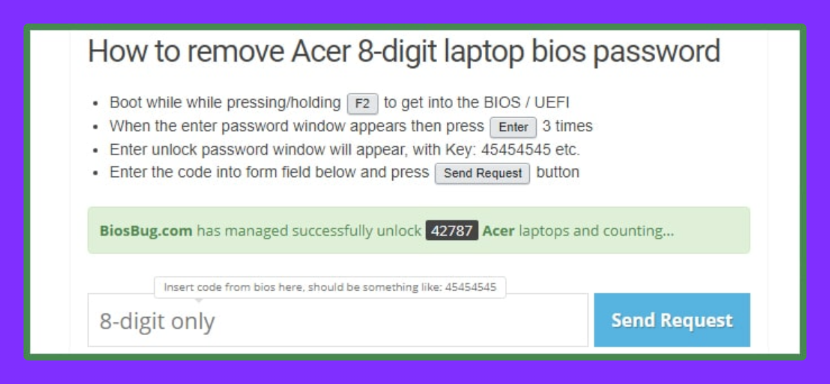 Записываем этот ключ, переходим по ссылке на сайт www.biosbug.com, и вводим этот ключ в поле 8-digit only. После чего нажимаем кнопку Send Reques