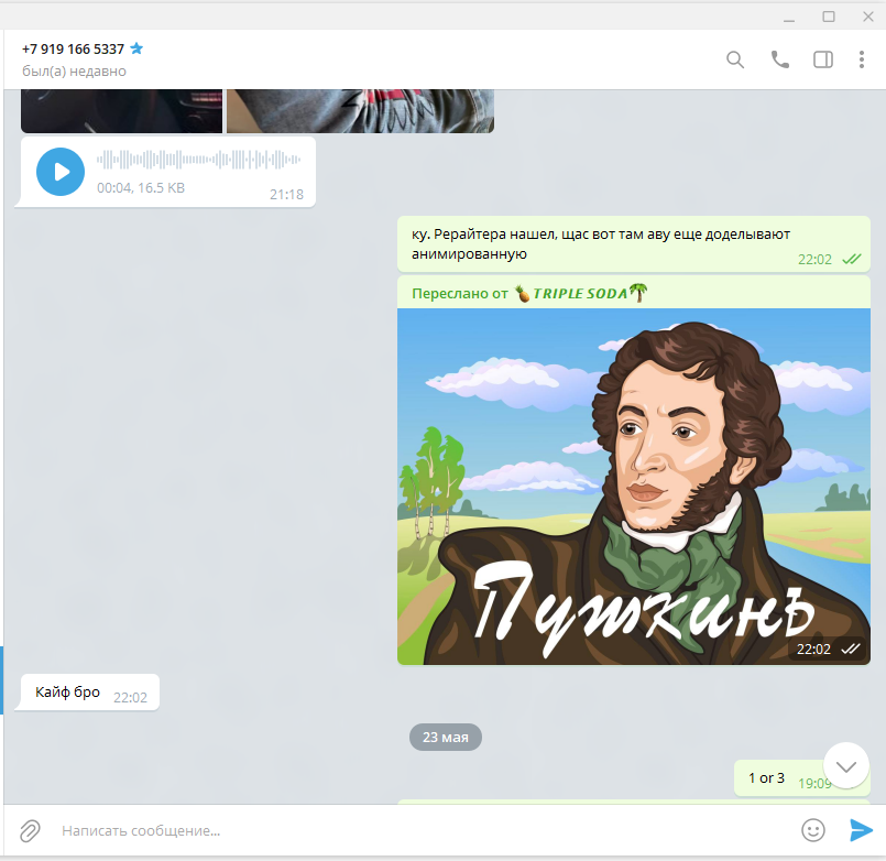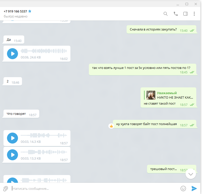 Тут снова были его войс высеры что те кто не берут такие посты - долбоебы. В итоге мы пришли к тому что я хочу качественный канал с качественной ЦА, а темат истории под мои хотелки не попадает. На этом все и закончилось с моим Пушкинъ и я снова ухожу в несколько недель раздумий.