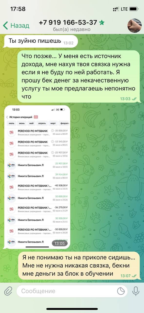 После оплаты мы обговаривем план созвонов и приступаем к "обучению". Не хочу сейчас быть необъективным и хуесосить его за каждое его дейтсвие, но от каких то эмоций я уже давно отошел и могу сказать объективно - его обучение полная поеботина. Тупые созвоны по 20 минут. Допустим это для прям фулл новичка еще было бы полезно, вопросов нет. Но хочу отметить что наш Никитка вообще полный похуист и понятие "чужое время" даже в эмбрионном состоянии не знакомо. Большое количество раз когда он просто забивал хуй и приходилось ждать его звонка по часу-полтора. На тот момент я закрыл глаза, так как мы только начали взаимодействовать и какой то негатив со своей стороны мне казался неоправданным. Тем более этот человек учить меня заработку...