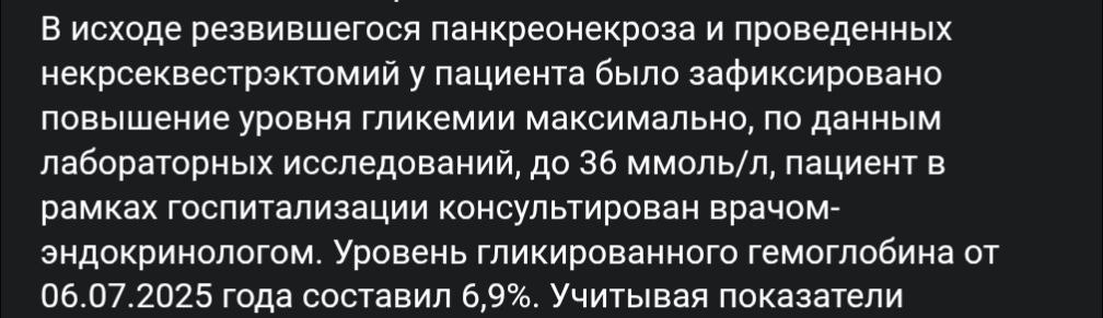 После удаления поджелудочной мои сахара прыгнули до 36 ммоль/л, когда нормальное значение — это 6-7 ммоль/л. 36 — это уже близко к гипергликемической коме. И кому я в итоге получил, только не гипергликемическую, да и немного попозже. Конкретно в этот момент у меня панкреонекроз РЕЗВИЛСЯ.