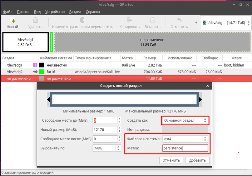 В открывшемся окне выбираем максимально допустимый объем памяти для раздела, в пункте "Создать как" выбираем "Основной раздел", файловую систему выбираем Ext4. В поле "Метка" прописываем persistence и затем нажимаем добавить: