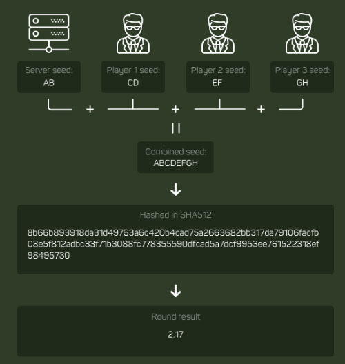 Формирование итога раунда зависит от 4 участников — игрового оператора и первых трех пользователей, которые совершили ставки.