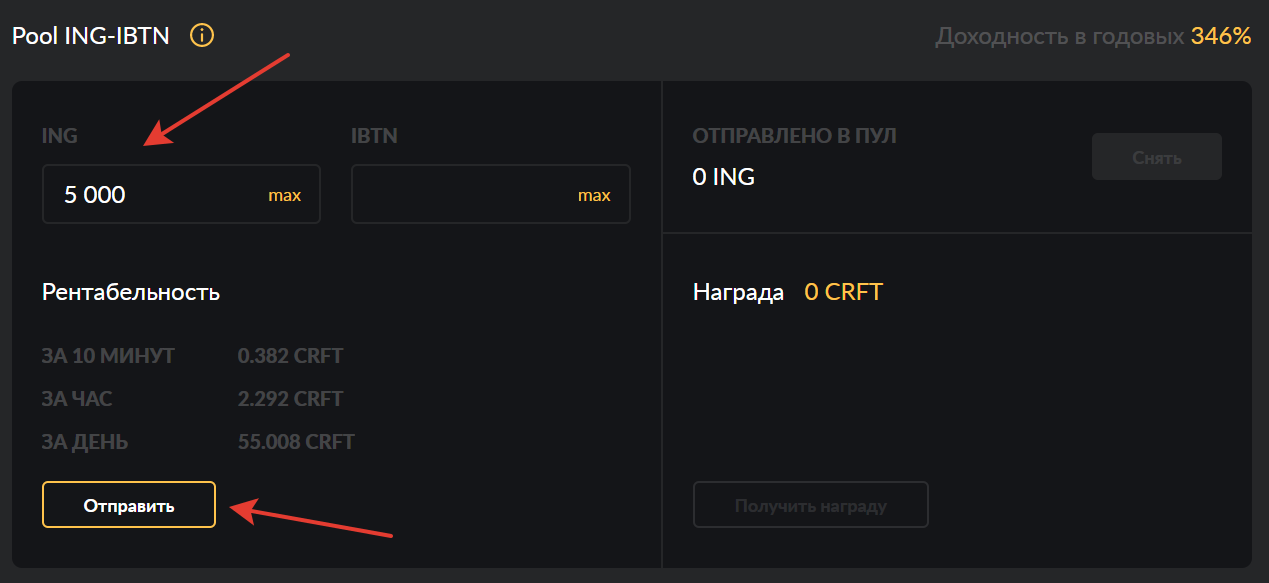 - В пуле ING-IBTN вводим количество ING, которые хотим застейкать и нажимаем "Отправить". (IBTN необязательный токен)