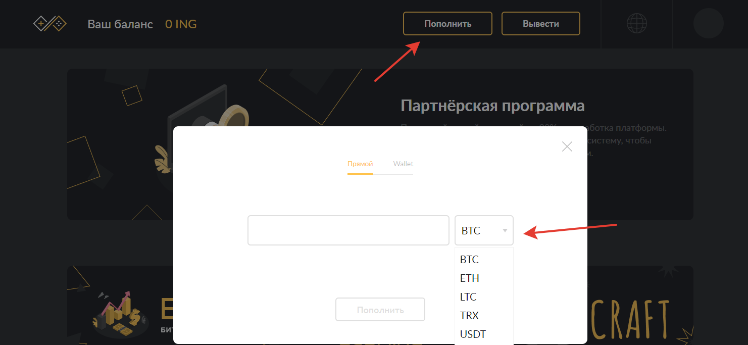 - Пополняем баланс. Для этого нажимаем кнопку "пополнить" и выбираем токен, которым будем осуществлять пополнение.