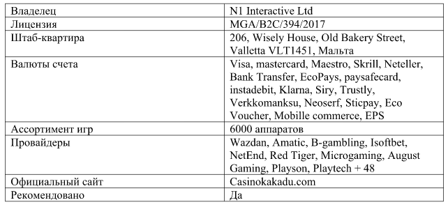 Casino kakadu принадлежит оператору N1 Interactive Ltd. Это популярный холдинг, развивающую собственную сеть онлайн казино. Какаду работает легально. Оператор сертифицирован Malta Gaming Authority.