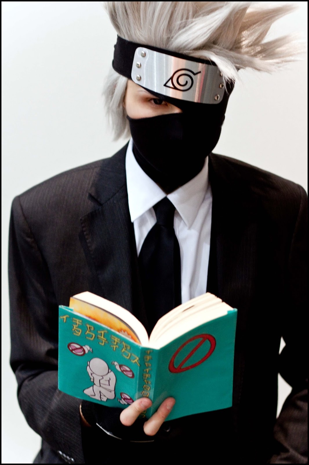 @hoshikosplay goes a little step further with authenticating the cosplay with her addition of one of the Icha Icha books, which is a series of adult novels written by Jiraiya, another famous character in Naruto, that Kakashi is always reading in the series. The book has some perverted content in it, so both of the cosplayers' reaction in the photo is perfect.