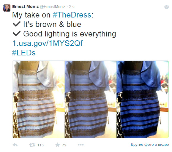 Какого цвета это платье? Казалось бы, какие тут могут возникнуть сложности? Но единства в этом вопрос нет: три четверти опрошенных считают платье бело-золотым, а одна четверть — сине-черным .