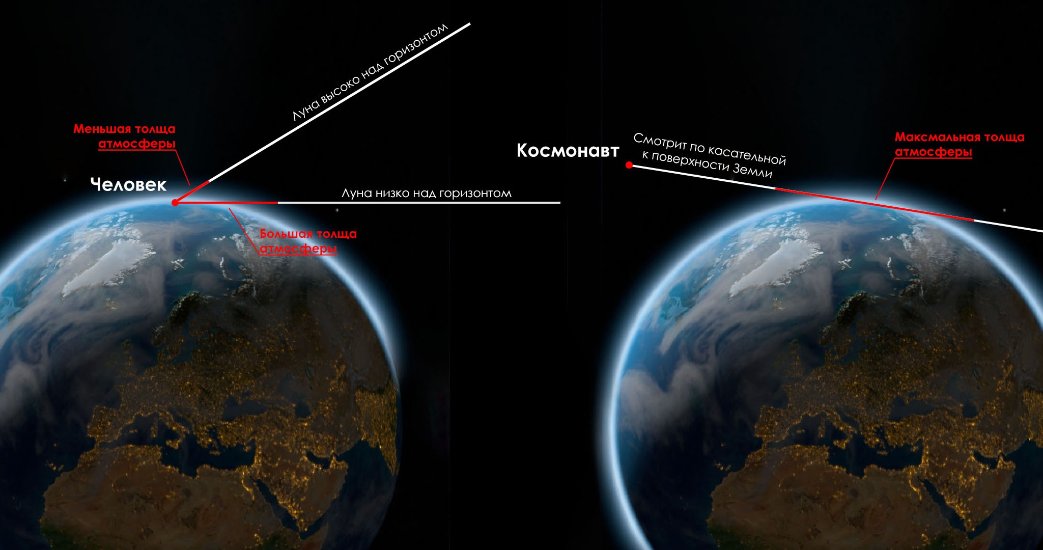 Теперь представим, что Луна прямо у горизонта, она довольно красная, но вообще-то можно сделать рэлеевское рассеяние ещё эффектнее, увеличив толщу земной атмосферы. Это доступно космонавтам, которые могут смотреть на Луну через в два раза большую толщу воздуха, чем человек на поверхности Земли.
