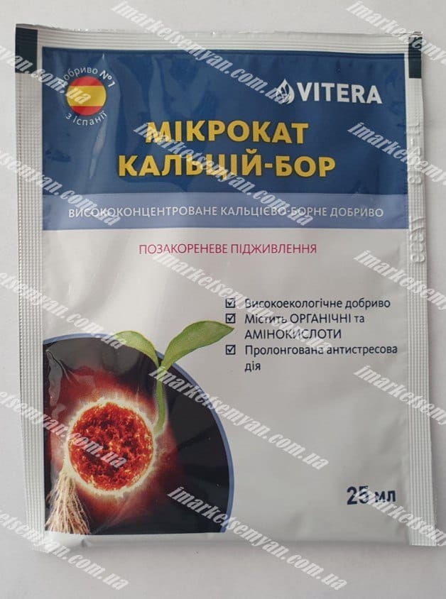 Микрокат Кальций Бор - высококонцентрированное жидкое кальциево-борное удобрение, содержит органические и амнокислоты . Свойства удобрения: Удобрение легко усваивается растениями . Обладает пролонгированным антисрессовым действием . Способствует повышению эластичности тканей, улучшает устойчивость плодов к растрескиванию .