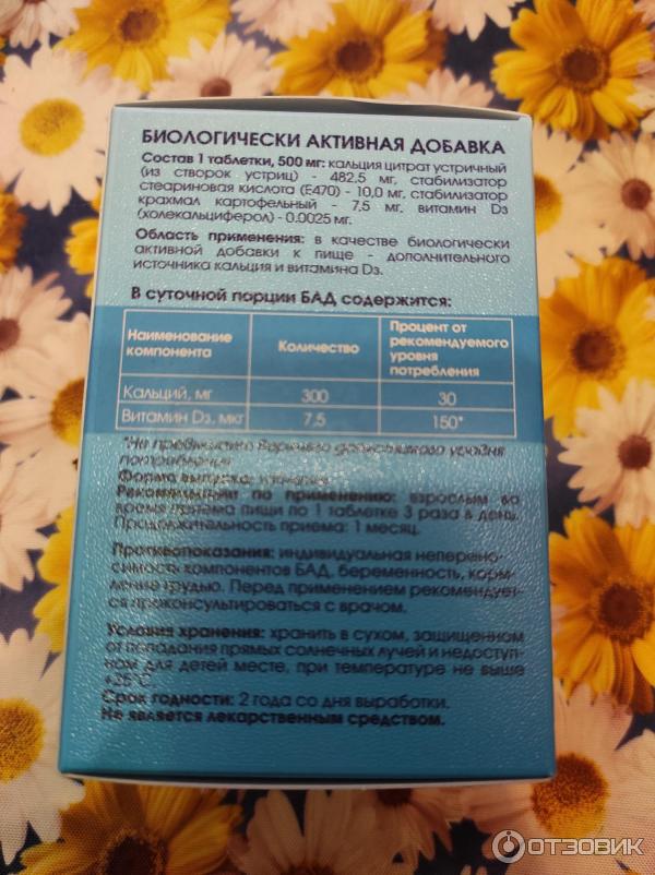Кальция цитрат Устричный с витамином D₃ . Устричный кальций . Биологически активная добавка к пище . Состав одной таблетки, 500 мг: кальций цитрат из морского моллюска устрицы — 482,5 мг, стеариновая кислота — 10 мг, картофельный крахмал — 7,5 мг, витамин D 3 — 0,0025 мг .