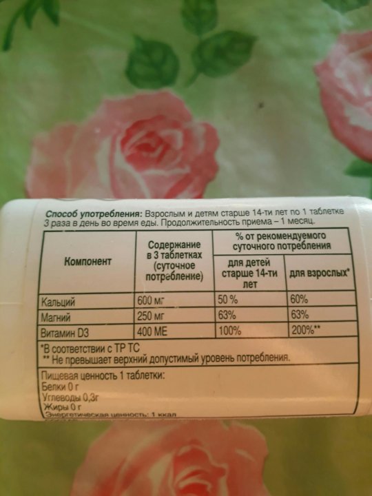 В состав входят кальцинированные водоросли, одни из самых богатых природных источников кальция и магния . 600 мг Кальция 250 мг Магния 400 МЕ (10 мкг) витамина D3 Цена - около 600 рублей, количество таблеток - 90, принимать нужно по 1 таблетке 3 раза в день . Показать цитату