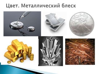 Металлический блеск — наблюдается у самородных металлов, но некоторые минералы с . . .
