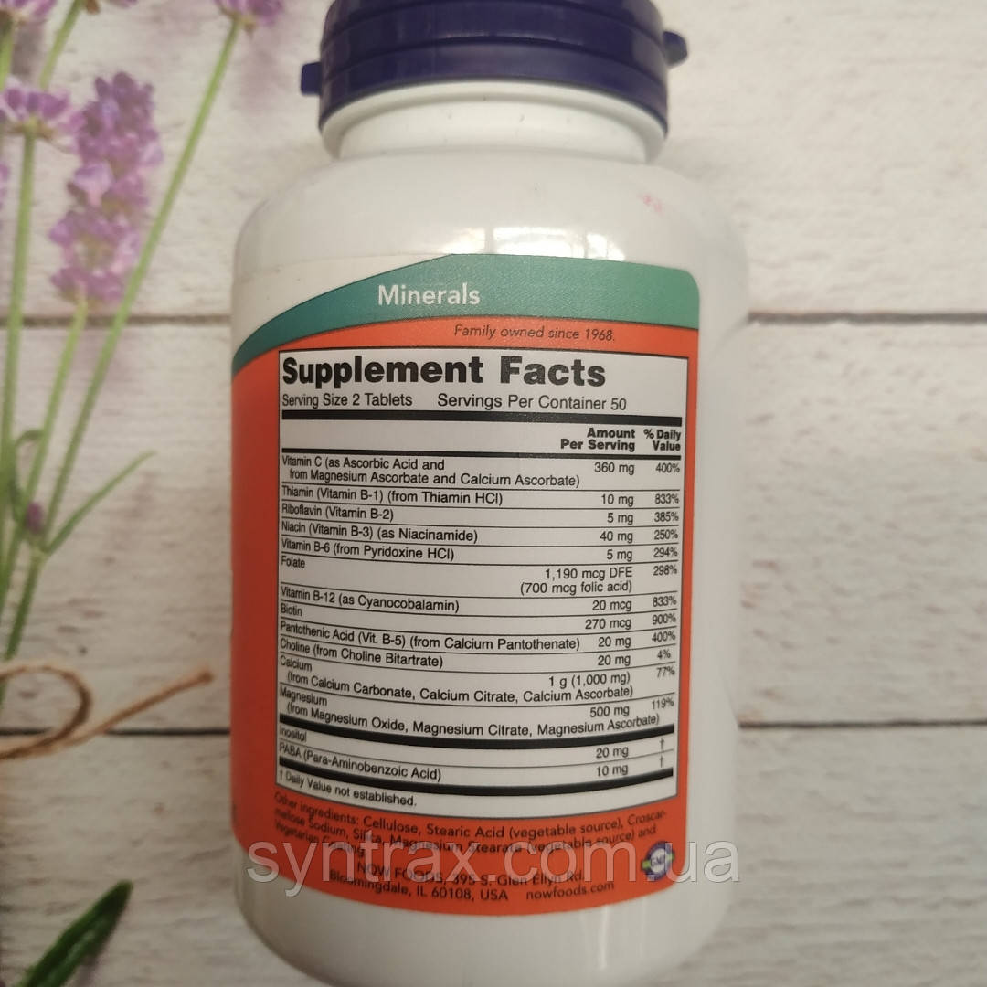 Состав В двух таблетках: Витамин С (в виде аскорбиновой кислоты и из аскорбата магния и аскорбата кальция) - 360 мг (400% суточной нормы) Тиамин (витамин B-1) (из тиамина гидрохлорида) - 10 мг (833% суточной нормы) Рибофлавин (витамин В-2) - 5 мг (385% суточной нормы) Ниацин (витамин B-3) (как ниацинамид) - 540 мг (250% суточной нормы)