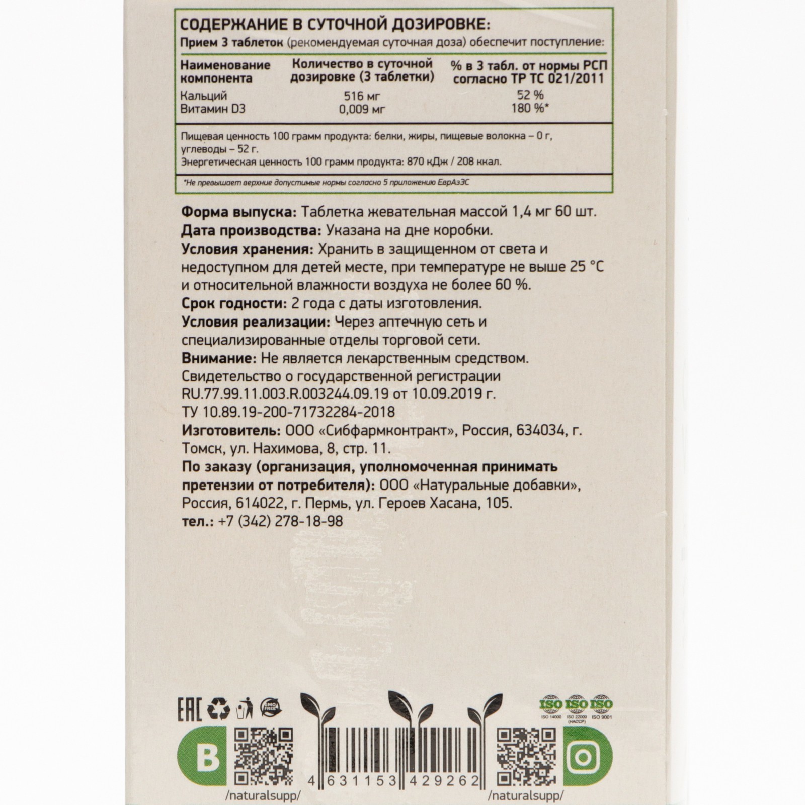 Кальций, витамин D3 и магний способствуют укреплению костной ткани и профилактике остеопороза, уменьшению судорог икроножных мышц и обеспечивают нормальную работу сердечно-сосудистой системы . Состав активных компонентов на 1 таблетку: Кальций (цитрат кальция) 200 мг Магний (оксид магния, цитрат магния, стеарат магния) 100 мг