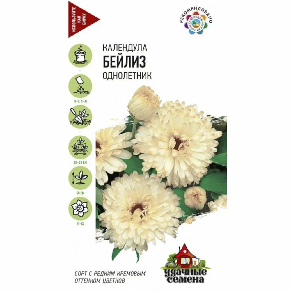 Календула Бейлиз 0,3 г Уд . с . Арт: 10004149 . Популярное, неприхотливое растение из семейства Астровые, высотой 50 см . Соцветия махровые, кремово-белой окраски, диаметром 7-8 см .