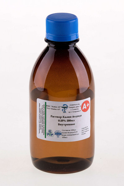 Раствор Калия йодида 3 % расфасован во флаконах по 200 мл . Капли для глаз реализуются во флаконах по 10 мл . Фармакологическое действие Фармакопея свидетельствует, что препарат оказывает воздействие на функции щитовидной железы, влияя, в частности, на процесс образования гормонов .
