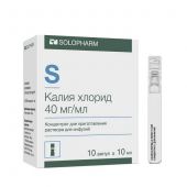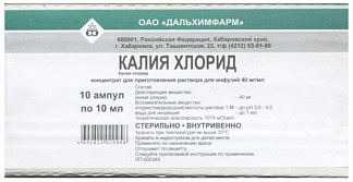 Калия хлорид, концентрат для приготовления раствора для инфузий, 40 мг/мл, №10 - ампула 10 мл (10) - коробка (коробочка) картонная с ножом ампульным, Производитель: Дальхимфарм (Россия)
