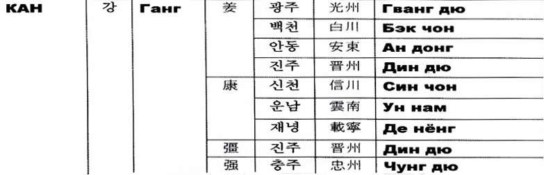 Корейская фамилия Кан (강) имеет несколько различных иероглифических начертаний и идет после первых пяти распространенных в Корее: Ким, Ли, Пак, Цой и Тен.