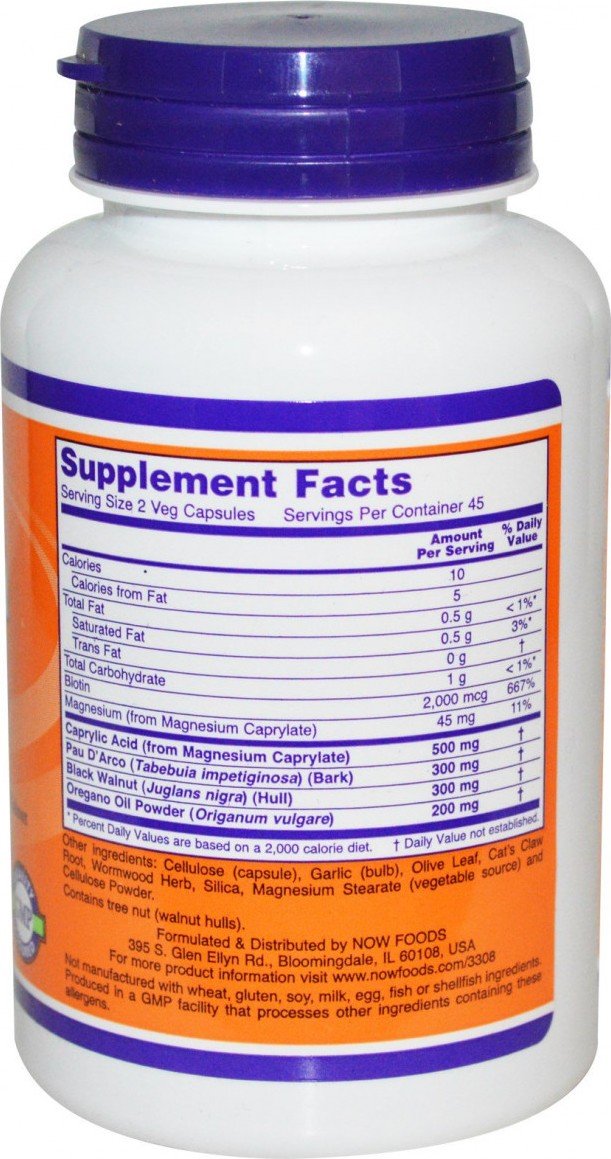 Эффективное противопаразитарное средство . Отлично борется против кандидоза, дрожжевых грибков, патогенных бактерий, паразитов и вирусов . Состав в 2 капсулах . Биотин 2 мг . Магний (from Magnesium Caprilate) 45 мг . Каприловая кислота (from Magnesium Caprilate) 500 мг . Пау Д Арко (Tabebuia impetiginosa) (кора) 300 мг .