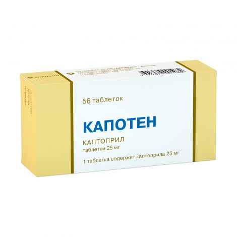 Капотен (МНН - Каптоприл) выпускается в виде таблеток по 25 мг, в блистерах по 14 таблеток, в картонной упаковке находится 1-4 блистера . Фармакологическое действие
