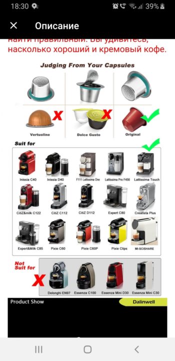 Каталог включает в себя капсулы с кофе подходящие для капсульных кофемашин Delonghi , все капсулы гарантированно подходят по размеру и габаритам,