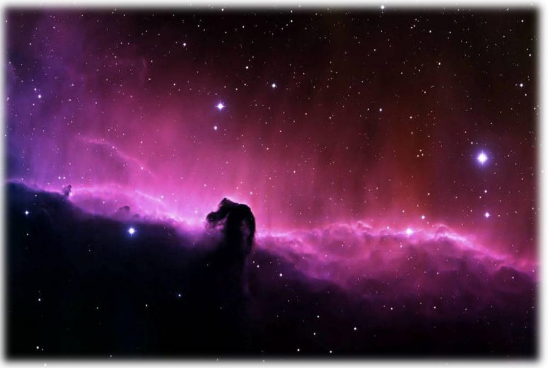 По направлению к чертогу Рады в тёмной Нави находится туманность «Конская голова» (тёмная туманность в созвездии Ориона. Туманность приблизительно 3,5 световых года в диаметре и расположена южнее Альнитак (ζ Ориона), восточной звезды Пояса Ориона, и является частью Облака Ориона, огромного газопылевого комплекса звёздообразования, который окружает расположенную на расстоянии около 1500 световых лет Ориона. Одна из наиболее известных туманностей, видна как тёмное пятно в форме конской головы на фоне красного свечения. Красное свечение объясняется ионизацией водородного газа, находящегося за туманностью, под действием излучения от ближайшей яркой звезды ζ Ориона. Темный фон туманности возникает в основном за счёт поглощения света плотным слоем пыли, хотя слева есть участки, на которые падает тень от основания шеи Конской головы. Истекающий из туманности газ движется в сильном магнитном поле. Яркие пятна в основании туманности Конская голова — это молодые звёзды, находящиеся в процессе формирования. Впервые туманность была обнаружена в 1888 году на фотографиях Гарвардской Обсерватории. В левом верхнем углу фотографии видна яркая область, в которой молодые звёзды уже образовались, и излучение от этих звёзд уже разрушило родительские газопылевые облака, а излучение молодой, массивной звезды, расположенной за верхней частью фотографии, своим светом вырисовывает Конскую Голову).