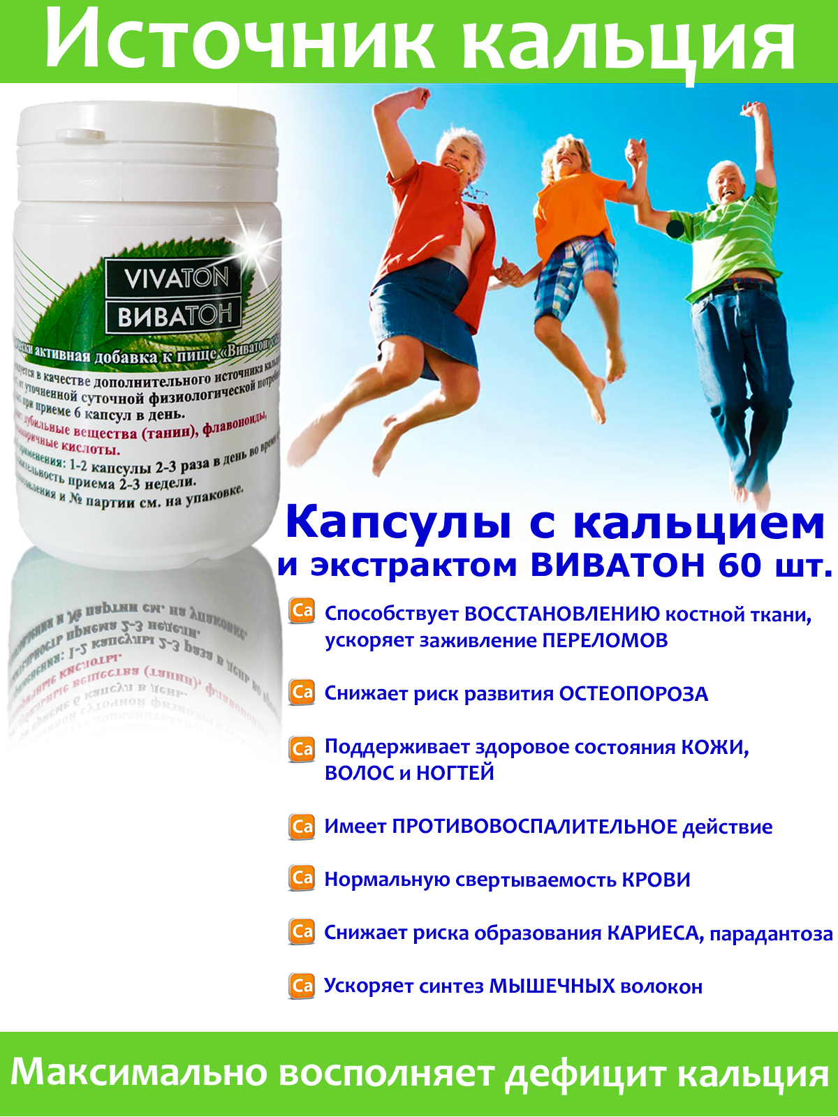 Карбонат кальция «ВИВАТОН» Кальций - один из главных компонентов нашего организма . Он входит в костную и мышечную ткань . При его недостатке кости становятся хрупкими, зубы быстро портятся . Поэтому важно обеспечивать должное количество данного минерала . Карбонат кальция «ВИВАТОН» оказывает положительное воздействие на: иммунную систему .