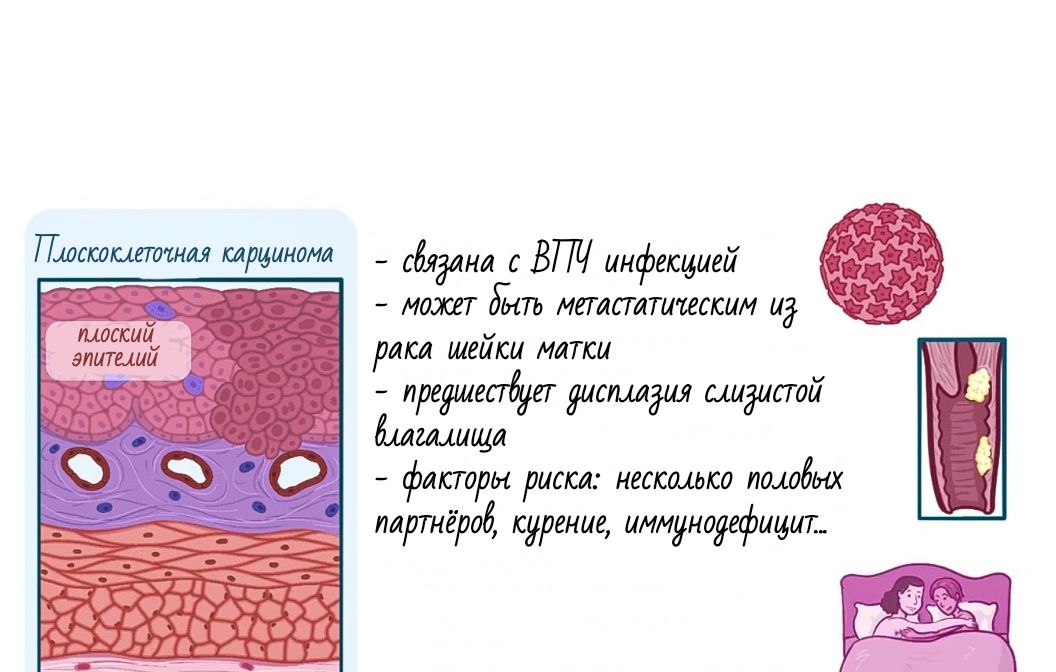 Первые признаки рака влагалища сложно отличить от симптомов других, менее опасных рак вульвы (наиболее распространенный вид — плоскоклеточная карцинома вульвы)