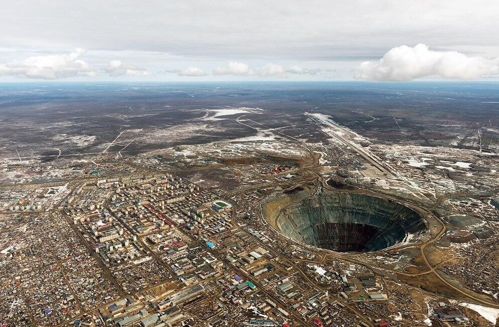 0 . Смотреть все фото в галерее . Город Мирный в Якутии считается алмазной столицей России . Собственно, он и стоит на самом краю гигантской дырки в земле . Когда подлетаешь - дух захватывает . Удивительно, конечно, на что способен человек . 0 . 01 . Заправляет тут всем "Алроса" .